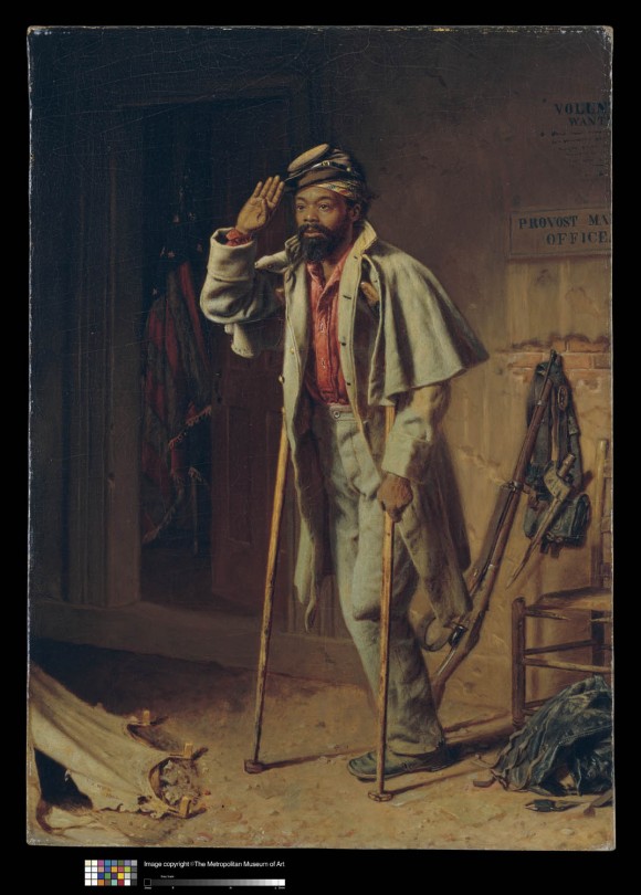 - Description: This is the right hand portion of a triptych showing an African American man in the same location at three stages of his military career. Here, now on crutches, with his left leg amputated at the knee and wearing rumpled Union blue, he salutes outside of the Provost Marshall's Office. Inside the office is a large U.S. flag, on the wall outside hangs a rifle, ammunition belt, and mess kit. A ragged knapsack lies at his feet.