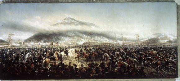 - Description: This painting shows troops in the foreground massed on a plain below a mountain with some cloud cover. At the base of the mountain, troops can be seen charging forward and clouds of smoke from gun and cannon fire can be seen across the horizon.