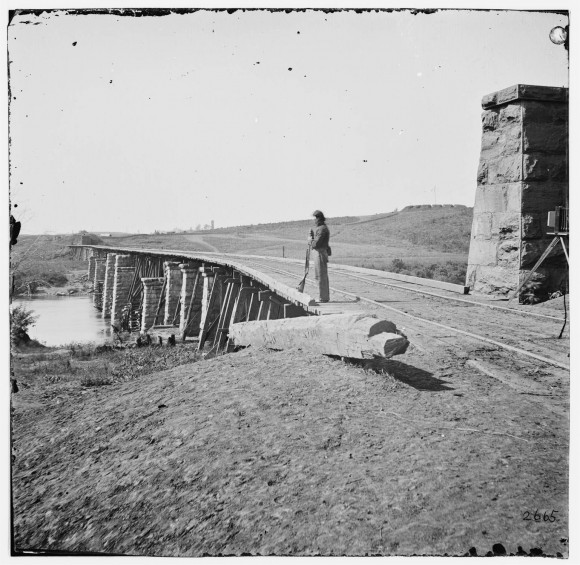 - Description: This photograph depicts a standing soldier resting his gun on end next to the near side of a railroad bridge whose wooden rail bed is supported by stone pillars.