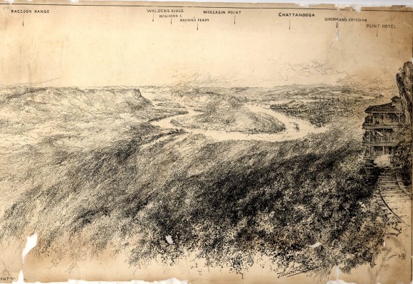 - Description: Ink drawing, possibly based on a stereoscopic photograph, of the sweep of Tennessee River including Moccasin Bend. Some locations are labeled across the top of the sheet. The labels, left to right, read: Raccoon Range, Waldens Ridge, Williams I., Brown's Ferry, Moccasin Point, Chattanooga, Sherman's Crossing, Point Hotel. The three-story building with open porches at right has the appearance of a rustic hotel. A locomotive heading down the track passes directly by the hotel.