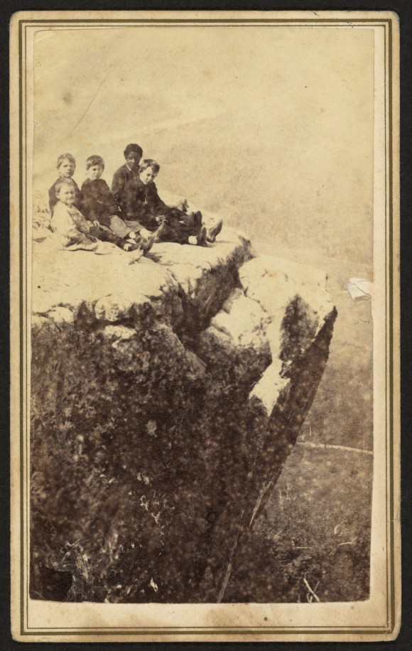 - Description: This photograph shows five children: four white boys varying in age from about 5 to 12 years old, and one African American boy, probably age 10 to 12, seated on a rock formation high above a wooded landscape.