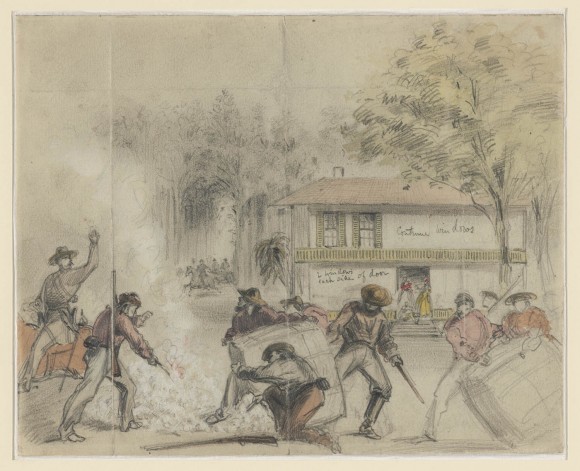 - Historical Note: The artist wrote on the reverse of this drawing: "Cotton Burners on the border of SW Tennessee and Mississippi surprised by Federal Scouts." Frank Vizetelly (1830-1883) was a British artist and war reporter for the Illustrated London News. This drawing comes from a collection of his work in Harvard University's Houghton Library (MS Am 1585) that includes 29 Civil War drawings. Here he described the scene of Confederate partisans surprised by the Indiana cavalry while destroying bales of cotton as "frightened whites and negroes looked on from the house." The image was published as a wood engraving in the Illustrated London News on August 9, 1862. Vizetelly was later banned from traveling with the Union Army by Secretary of War Edwin Stanton after he portrayed Union troops fleeing at the Battle of Manassas. According to historian Douglas W. Bostick, the artist spent the latter part of the war sketching scenes more in sympathy with the Confederate cause.