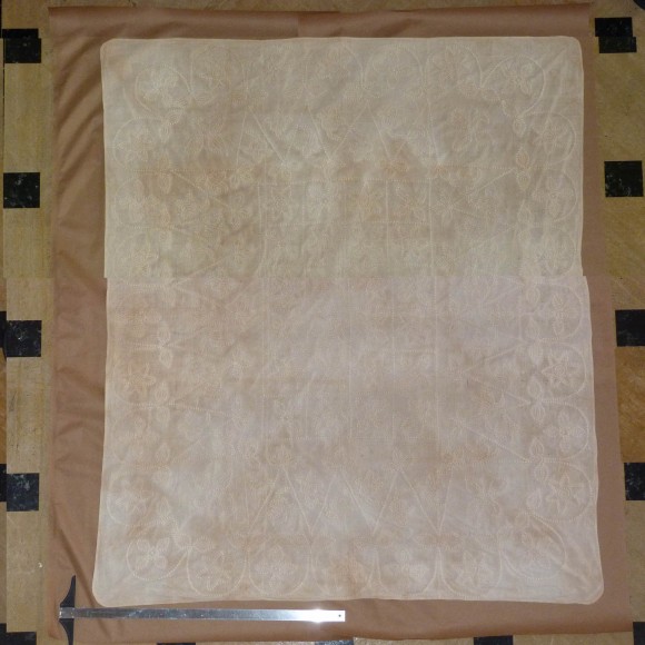 Historical Note: This carefully stitched coverlet was made from unbleached cotton. It is said to have been crafted by one or more slaves of Mrs. William Winfree, great great grandmother of William Williams Dupree. It may have been made by skilled needleworkers or visiting seamstresses from a neighboring cotton plantation. The pattern alternates star and floral shapes with leaves, set into a grid, with geometric cone and curved shapes forming a surrounding motif.