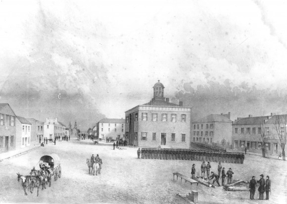 - Description: The image depicts troop formations around a courthouse with cupola. There are five artillery pieces in front of the courthouse, positioned around a large, open square with one pointed down a street. Other vignettes in the scene include a man driving a laden carriage out of the square, a group of soldiers standing around buckets on a fire next to a table, and a couple of soldiers on horseback in the foreground.
