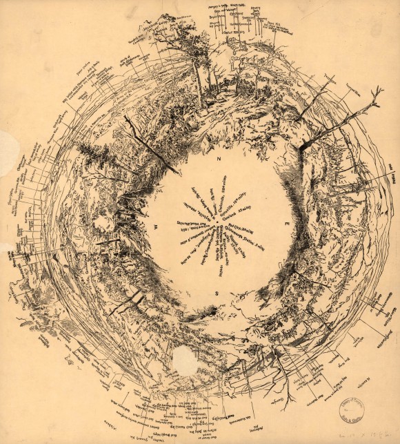 - Description: Panoramic of Chattanooga, apparently from above, showing 360 degree view of landscape that has been labeled with information relevant to the geography and the Civil War troop locations in the area. Image includes vegetation and topography.
