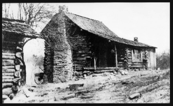 Description: This photograph shows a single pen cabin with gable end stone chimney and front porch standing in a cleared field. There is a corner of a log cabin visible at left.