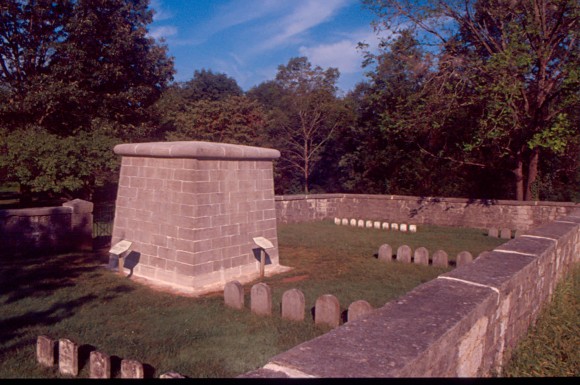 Description: This color photograph taken in 2003 shows the rectangular limestone monument and tombstones are enclosed by a stone wall. Trees and grass surround the area.