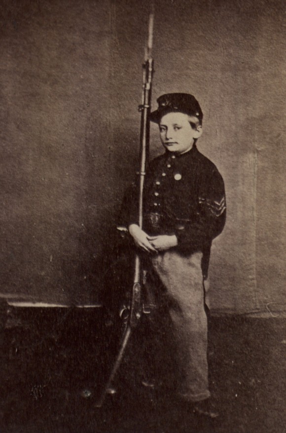 Historical Note: Ten-year-old drummer John Lincoln Clem, of Newark, Ohio, became famous as "Johnny Shiloh" after he survived a shrapnel shell during the Battle of Shiloh that crushed his drum. Having been refused entry in the Third Ohio because of his young age, he tagged along with the 22nd Michigan Infantry, which issued him a drum and a sawed-off musket. Having lived through Shiloh, he fought at Chickamauga and was wounded in Atlanta. After the war, President Grant appointed him to the regular army, in which he rose to the rank of Colonel, before retiring in 1903.