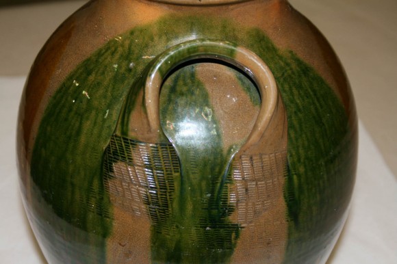 Description: Ceramic jug with two handles, impressions, and decorative red and green glazes.