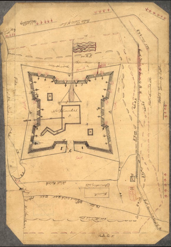 - Description: This hand-drawn map shows the plan of Fort Sanders from an aerial perspective. It is labeled with directional information, shows railroad tracks, and has symbols that appear to represent cannons drawn in red ink. Written on verso in lead pencil: Drawn by John G. Orth (Arcadia, Ohio). Went with Army 8/22/1862 for 3 yrs. Mustered out with Company 6/24/1865.