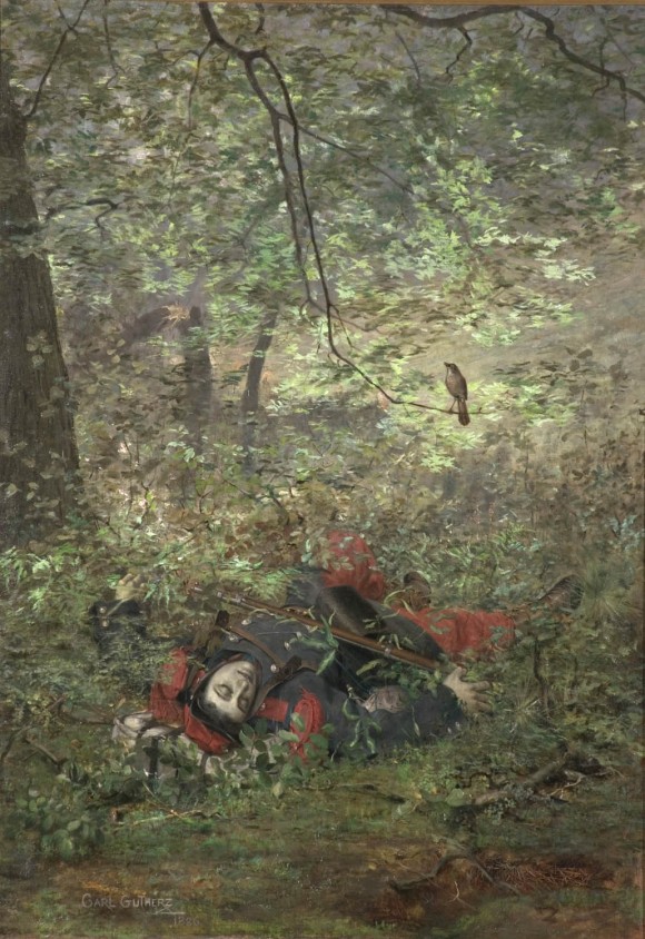 Historical Note: Carl Gutherz (1844-1907) arrived in Memphis with his family from Switzerland in 1860, when he was 16. His brother Fred joined the Confederate Army as an engineer. Too young to serve, Carl found work as a draftsman for a Memphis arms foundry and is reported to have smuggled contraband for the Confederate troops. After the war, Carl, determined to make an art career, returned to Europe. He was in Paris from 1869 to 1871, studying for a time at the Ecole des Beaux-Arts. Upon his return to the United States he became an art instructor in St. Louis, helping to establish the St. Louis School and Museum of Fine Arts. During his second tenure in Paris (1884-1896) he attended the Academie Julian. This poignant depiction of a dead soldier in the woods who can no longer hear the song of a bird, may have been intended to reference both the American Civil War and the Franco Prussian war. The soldier's uniform bears a resemblance to those of the Zouave units, which were adapted from the French elite soldier corps by both Confederate and Union armies. According to art historian Stanton Thomas, the 154th Tennessee Volunteer Regiment in which Gutherz's brother Fred enlisted was also called the Memphis Zouaves.