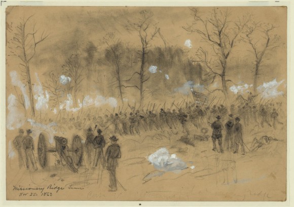 - Historical Note: This illustration by "Special Artist" Alfred R. Waud, depicts events occurring at the Battle above the Clouds. On November 25, 1863 Union forces under Generals Sherman, Thomas and Hooker attacked Confederate General Braxton Bragg's troops at Missionary Ridge along Lookout Mountain near Chattanooga. Sherman was out maneuvered by Confederate General Patrick Cleburne but later support from General Thomas carried the day. Artists like Waud could get closer to the battle than photographers, who were limited by their bulky equipment. Waud and Theodore Davis traveled the South after the War, including stops in Nashville and Memphis, to document the destruction and the process of rebuilding. Alfred Waud continued to produce illustrations for Harper's Weekly in the decades after the War. He also contributed to "Picturesque America" and to Century Magazine's "Battles and Leaders of the Civil War." The Library of Congress owns an extensive collection of Waud's drawings and sketches.