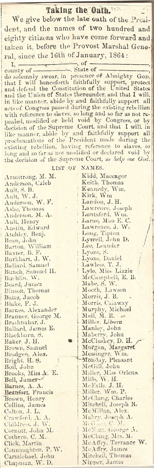 Description: Printed sheet of names of persons who had "taken the oath" of allegiance to the United States on or after 16 January 1864.