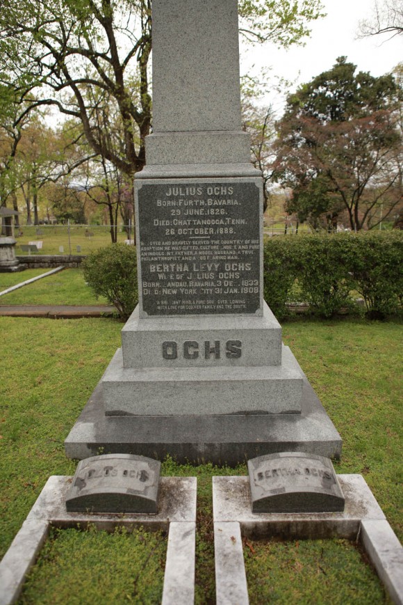 - Historical Note: This is the tombstone of the parents of Adolph Ochs, Julius and Bertha Ochs. Julius died in Chattanooga in 1888. Adolph, who was raised in Knoxville, had experienced life in that divided city during the war. His father Julius served in the Union army,while his mother, Bertha Levy, who had grown up on a plantation in the deep South, remained loyal to the Confederacy. Their tombstones reveal their conflicting sympathies. His reads: "He loved and bravely served the country of his adoption. He was gifted, cultured, noble and pure. An indulgent father, a model husband, a true philanthropist and a God-fearing man." Hers reads: "A brilliant mind, a pure soul overflowing with love for God, her family, and the South." While in Chattanooga, Adolph Ochs, a successful newspaper publisher who revived Chattanooga's daily and acquired the New York Times in 1896, was a prominent member of Chattanooga society, participating in some of the South's earliest Blue-Gray reunions and supporting the formation of the Chickamauga-Chattanooga National Battlefied as well as helping to preserve portions of Lookout Mountain.