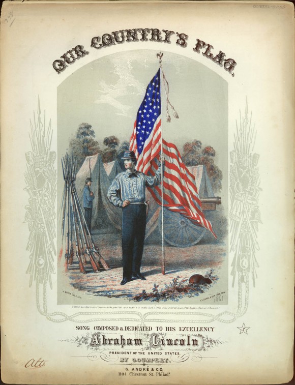 Historical Note: This colorful sheet music cover was published during the first year of the Civil War. Popular music, often played in civic settings, served to build morale as the country mustered for war. It is interesting to note that this song includes lyrics in German, reminding us that many young immigrants and first generation Americans either enlisted or were drafted into the armies on both sides. The young Union soldier holding the flag wears a uniform consisting of a blouse shirt and pants (no jacket) and neither he nor the camp behind him show any signs of the war weariness that set in once the early battles of the Civil War revealed the Confederate army to be a much more serious fighting force than the U.S. Army had anticipated.