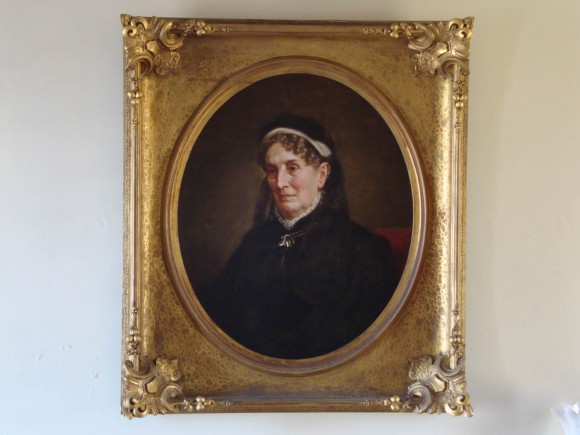 - Description: This oval portrait depicts an elderly woman wearing a stiff white collar, a dark dress with buckle pin and a dark veil of mourning.