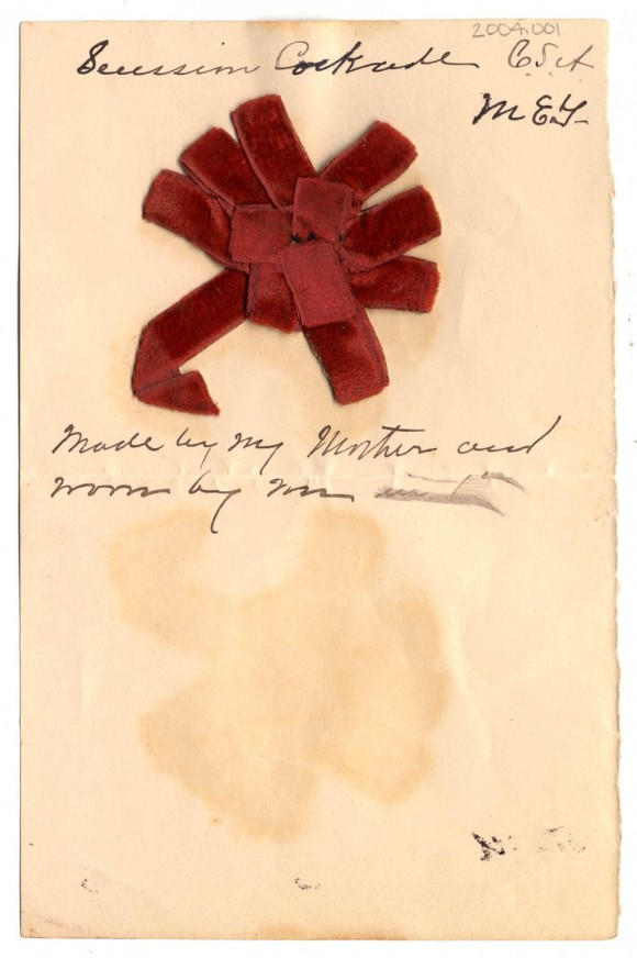 Description: This is a red velvet rosette made from a looped bow and attached to a card that reads, "Secession cockade, made by my mother and worn by me."