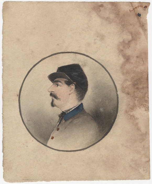 - Description: Profile portrait of the head and shoulders of a young man wearing Confederate uniform drawn in a round framing device.