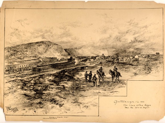 - Historical Note: Theodore Davis (1840-1894) was a "Special Artist" for news magazines such as Harper's Weekly and Leslie's Illustrated Weekly, illustrating news reports from the front. He was in the Chattanooga area in 1863 and 1864. The annotations on this drawing mention a limestone bridge and the Crutchfield House, as well as the Western & Atlantic Depot. The Western & Atlantic Railroad connected Tennessee to Georgia at Chattanooga.