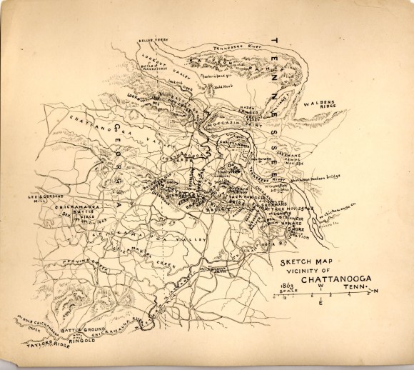 - Description: Map of Chattanooga and the surrounding area with locations and dates, as well as notations about troop positions and movements, of the battles that took place at Chickamauga and Lookout Mountain in 1863.