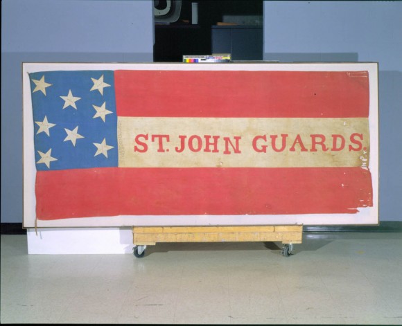 Description: This hand-sewn flag contains a blue rectangle with eight stars and three alternating stripes of red and white with the words, "St. John Guards."