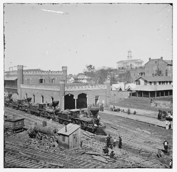 - Historical Note: Barnard was a photographer in the Topographical Branch of the Department of Engineers, Army of the Cumberland, United States Army with offices based at 89 Church Street in Nashville beginning in December 1863. Nashville had been captured by Federal troops in February of 1862 and Chattanooga had fallen in November 1863. Barnard traveled to Nashville, Knoxville, and Chattanooga in 1864. His focus in his work was the locations of strategic interest to the military: railroads, bridges and battlefields. Between January and September of 1864 Nashville was the scene of great activity as approximately 140,000 troops and immense amounts of supplies passed through the city as the Federal campaign moved south.This image of the Nashville rail yard shows the Nashville & Chattanooga Depot, designed by architect and engineer Adolphus Heiman. The Tennessee State Capitol is visible in the background.