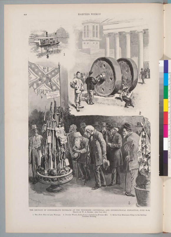 - Description: A series of images by artist W.A. Rogers (1854-1931) published in Harper's Weekly on July 3, 1897. The largest vignette shows elderly men viewing a display of armaments, ammunition, and military paraphernalia labeled "relics from Missionary Ridge." Other images include a boat on Lake Watauga (1) and grinding wheels from a Confederate powder mill (2).