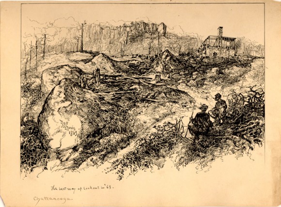 - Historical Note: This image of Lookout Mountain depicts the route of Union soldiers, who came straight up the face of the hill by the Cravens House to capture the strategic location held by the Confederates. The Cravens House is shown here as just a foundation and chimney. Historian Jim Hoobler believes that Union troops stripped off the wood siding to keep as souvenirs of their heroic victory. The devastation that the war wrecked on the landscape is pictured here.