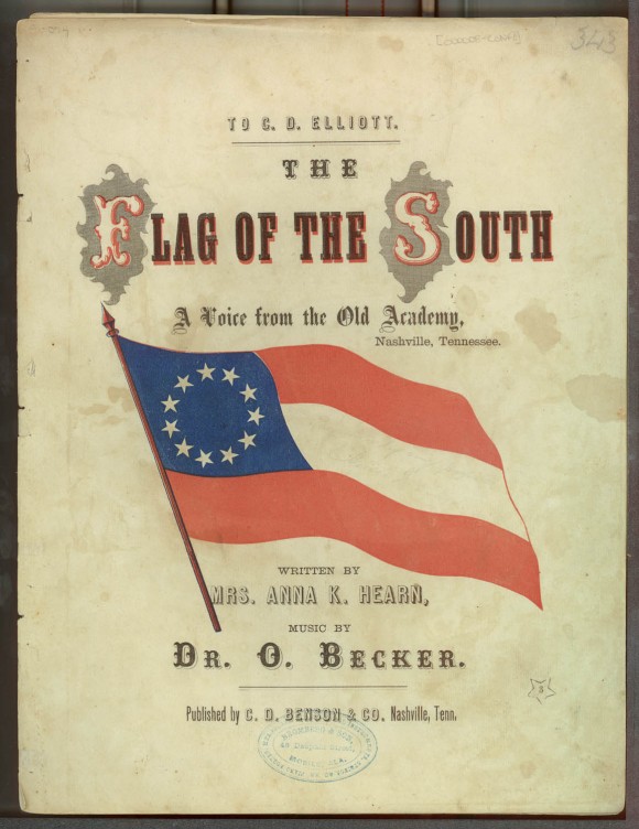 Historical Note: This sheet music depicts on its cover the first national flag of the Confederacy, identified by 11 stars representing the seceding states of South Carolina, Mississippi, Florida, Alabama, Georgia, Louisiana, Texas, Virginia, Arkansas, Tennessee and North Carolina. Flown from March 5, 1861, to May 26, 1863, this flag was eventually replaced by a flag with 13 stars, to include Kentcky and Missouri, which the Confederacy hoped would join in secession.