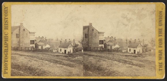 - Description: This stereographic image shows a hillside view of large houses and smaller outbuildings stretching out towards a misty horizon. The standing water, dead-looking vegetation, and leafless trees suggest that the time of year is late fall or early winter. This stereoscopic image was published by E.T. Anthony & Company, New York.