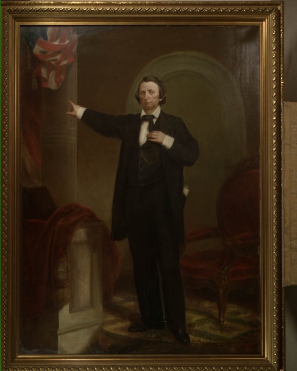 - Description: This painting is a full-length portrait of William G. Brownlow standing in front of a red chair while gesturing toward the United States flag.